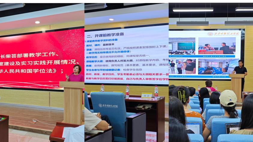副院长柴芸通报了新学期教学工作的准备、实验室建设和实习实践开展情况,对教学工作进行了布置安排。她重点强调了开课前各项教学要求、课堂教学质量管理,要求教师携带好课堂教学五大件、注重教师仪容仪表、以饱满的精神状态上好开学第一课。柴芸领学了《中华人民共和国学位法》,从制定背景、立法目的、依据及适用范围、基本制度、主要特色等方面进行了讲解。