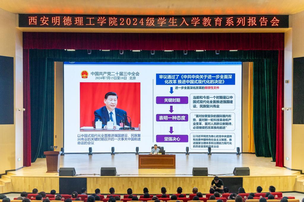 全覆盖开展“开学第一课”,点亮学生成长“指明灯”。学校聚焦理想信念教育,教育引导新生爱国励志求真力行,强化成才目标和学习动力,把个人梦想同民族复兴紧密融合在一起。为深入学习贯彻党的二十届三中全会精神,加强大学生思想政治教育,激励广大学生坚定理想信念、涵养家国情怀、砥砺奋斗精神,校党委书记马川鑫为新生讲授入学教育课。4000余名师生参加。