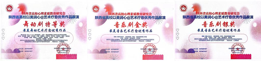 10月31日,陕西省高校以美润心艺术疗愈优秀作品展演在陕西艺术职业学院举行。学校报送的舞蹈作品《this is me》、声乐作品《明天你好》、器乐作品《高山流水》分别荣获舞动剧特等奖,音乐剧金奖和银奖等多项荣誉。