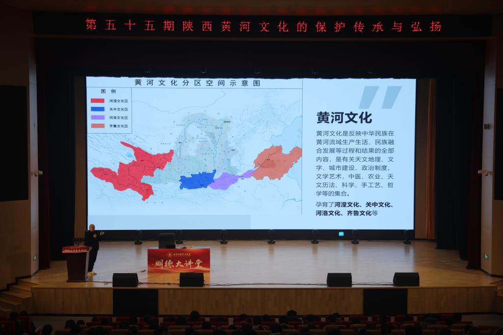 讲座现场,金栋昌教授以《陕西黄河文化的保护传承与弘扬》为题,从“黄河与黄河文化”、“陕西是黄河文化的核心”、“讲好新时代陕西黄河故事”三个方面对黄河文化进行解读。金教授强调黄河文化是反映中华民族在黄河流域生产生活、民族融合发展等过程和结果的全部内容,是有关天文地理、文字、城市建设、政治制度、文学艺术,中医、农业、天文历法、科学、手工艺、哲学等的集合。随着文明和高质量发展上升为国家重大战略,“黄河流域生态文明和高质量发展”的重要性也被提升到了新的高度。