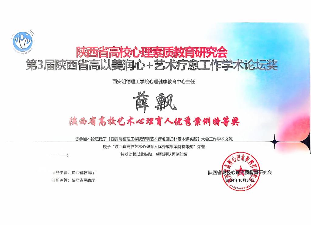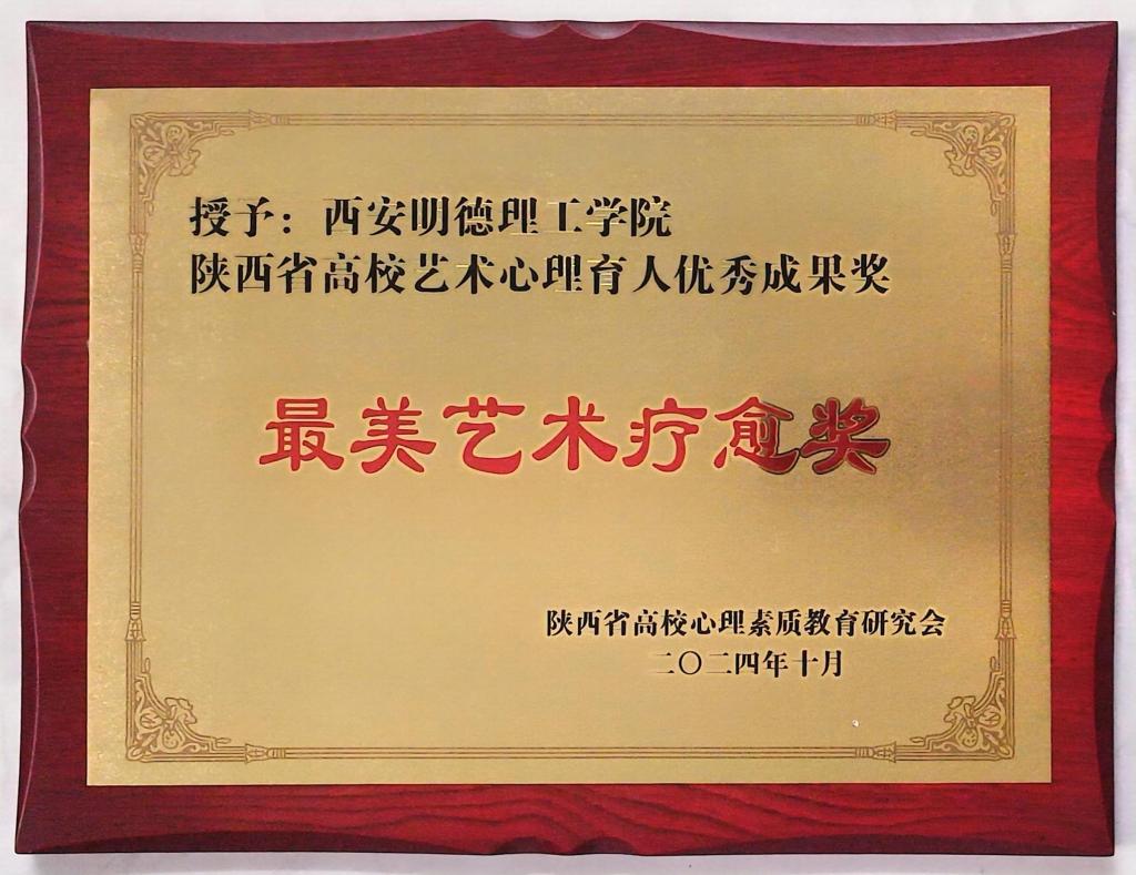 陕西省高校心理素质教育研究会授予学校“陕西省高校艺术心理育人优秀成果奖(最美艺术疗愈奖)”和“第三届陕西省高校以美润心艺术疗愈优秀作品展演(优秀组织奖)”。