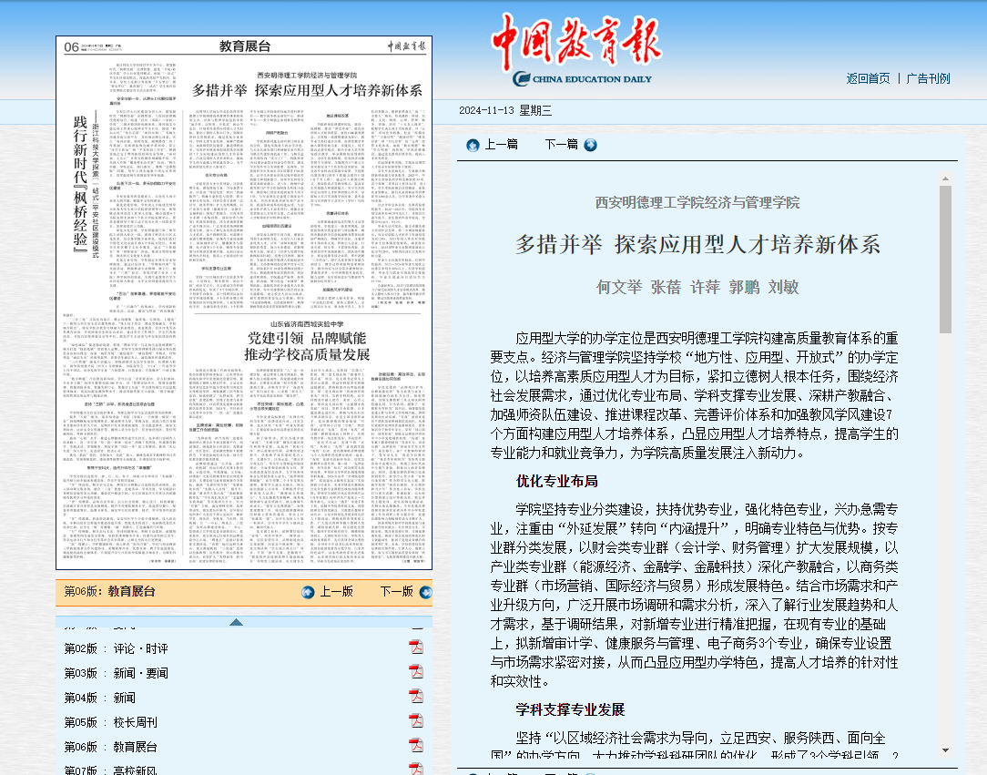 ac米兰官方网站经济与管理学院坚持学校“地方性、应用型、开放式”的办学定位,紧扣立德树人根本任务,以培养高素质应用型人才为目标,通过优化专业布局,深耕产教融合,建立一个结构合理、特色鲜明、整体水平较高的学科专业体系,培养既有一定理论知识储备更有下沉一线工作能力的大学生,人才培养质量得到社会的高度认可。11月13日出版的《中国教育报》第六版“教育展台”以《ac米兰官方网站经济与管理学院:多措并举探索应用型人才培养新体系》为题,报道了ac米兰经济与管理学院应用型人才培养改革经验。现将原文转载如下: