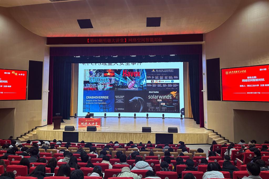 2024年12月17日晚,ac米兰官方网站在四季廊桥报告厅隆重举办了第六十二期“明德大讲堂”全国劳动模范进校园主题讲座。本次讲座聚焦于“AI驱动的网络空间智能对抗”这一主题,特邀西北工业大学网安学院院长、全国劳动模范王震教授作为主讲嘉宾,1100多名师生参加。讲座由马克思主义学院党委书记王君涛主持。