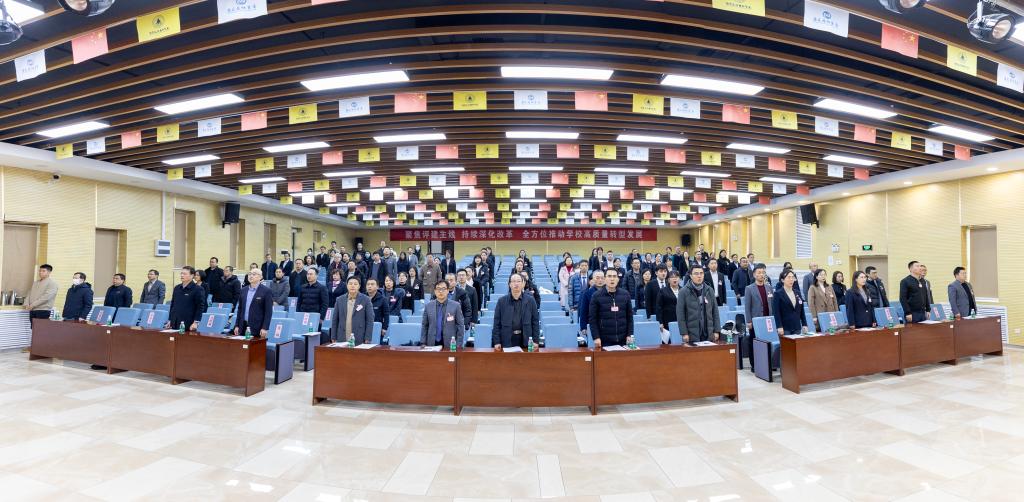 校长王志刚作了题为“聚焦评建主线持续深化改革全方位推动学校高质量转型发展”的工作报告。报告全面回顾了一年来学校在各方面取得的成绩,一是坚持思想建校,引领教育事业发展;二是坚持质量立校,提升教学育人水平;三是坚持人才强校,发挥人力资源效能;四是坚持改革兴校,推动办学创新发展;五是坚持特色名校,增强综合办学实力;六是坚持依法治校,夯实转型发展基础。在此基础上,客观分析了学校当前建设中存在的差距和不足。提出了学校2025年工作的指导思想和基本思路,并围绕顺利通过本科教学工作合格评估和高质量转型发展“两大历史任务”,提出了“十二个聚焦和十二个扎实推进”的主要举措,为顺利通过本科教学工作合格评估奠定坚实基础。大会认为,学校工作报告对进一步统一思想,凝聚共识,聚焦本科教学评建工作、推动学校高质量转型发展具有重要意义。