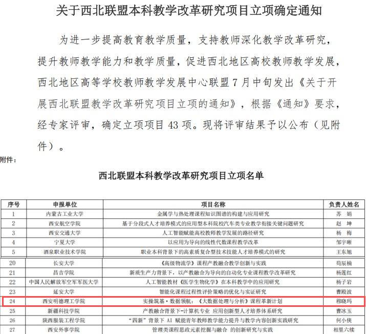 今年7月中旬,西北地区高等学校教师教学发展中心联盟启动了本科教学改革研究项目立项申报工作。ac米兰积极响应,广泛动员二级学院教师参与,共收到8个申报课题。鉴于申报名额(1个)的限制,学校秉持严谨公正的态度,组织专家对各申报项目进行了严格评审,最终评审推荐信息工程学院穆晓玛老师主持的项目参加西北联盟本科教学改革研究项目立项评审,现成功斩获立项资格。