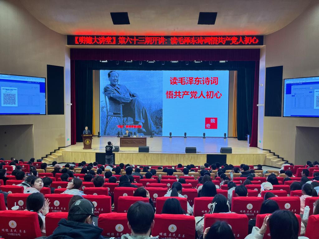 3月18日晚,第六十三期明德大讲堂在四季廊桥报告厅成功举办。本期大讲堂以“读毛泽东诗词悟共产党人初心” 为主题,由西北政法大学魏奇教授主讲,马克思主义学院副院长惠斌主持。来自全校1200多名学生齐聚一堂,共同沉浸于毛泽东诗词的魅力世界,探寻中国共产党人的初心与使命。