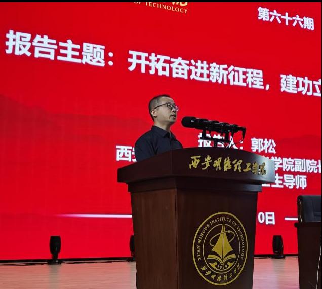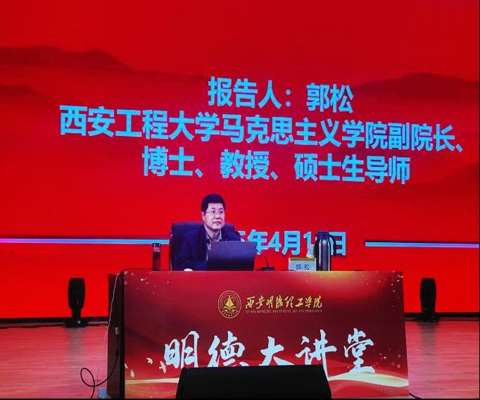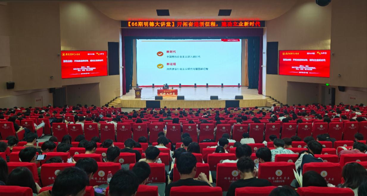4月10日晚,ac米兰官方网站第六十六期明德大讲堂在四季廊桥报告厅成功举办。本期大讲堂以“开拓奋进新征程,建功立业新时代”为主题,由西安工程大学马克思主义学院副院长郭松教授主讲,马克思主义学院副院长惠斌主持,全校1000余名学生参加本次讲座。