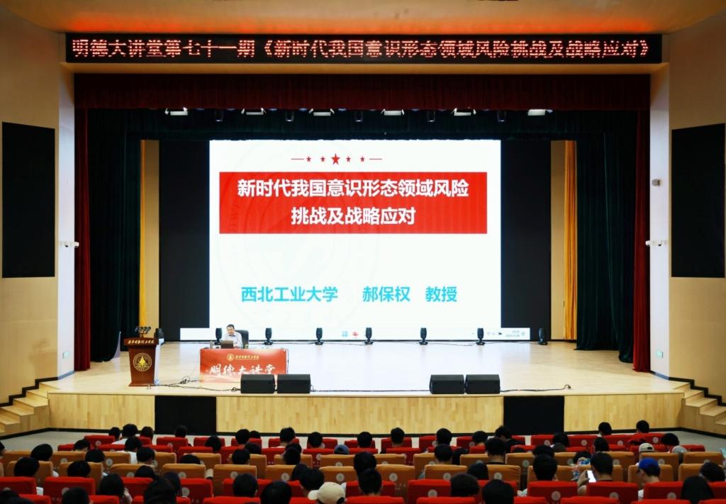 为全面推进校园阅读文化氛围营建,助力“学在明德”品牌内涵共建, 图书馆联合马克思主义学院、党委组织宣传部、党委学生工作部,于5月28日下午,特邀西北工业大学教授、博士生导师郝保权,在四季廊桥报告厅开展《新时代我国意识形态领域风险挑战及战略应对》主题讲座。本次讲座由图书馆副馆长强丽丽主持,1100余名师生齐聚一堂,共同探讨在新时代我国意识形态领域面临的风险挑战及应对策略。该活动是2025年“科技明德·共读未来”阅读文化节系列活动之一。