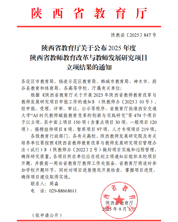 近日,陕西省教育厅下发了《陕西省教育厅关于公布2025年度陕西省教师教育改革与教师发展研究项目立项结果的通知》(陕教函〔2025〕847号),ac米兰教师在此次立项中成绩斐然,实现新的突破。