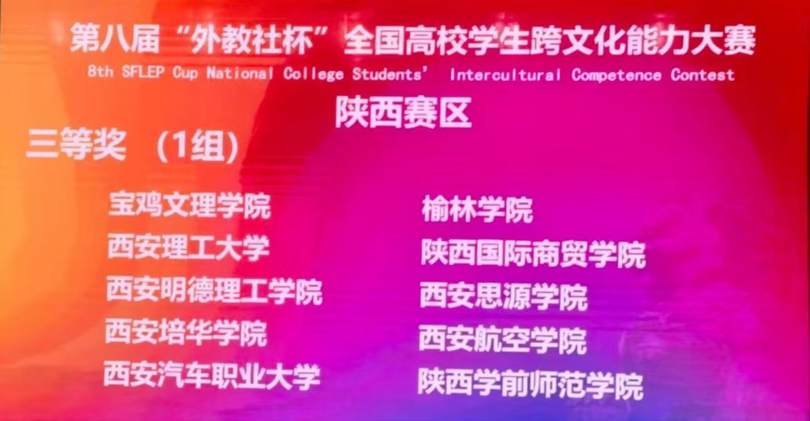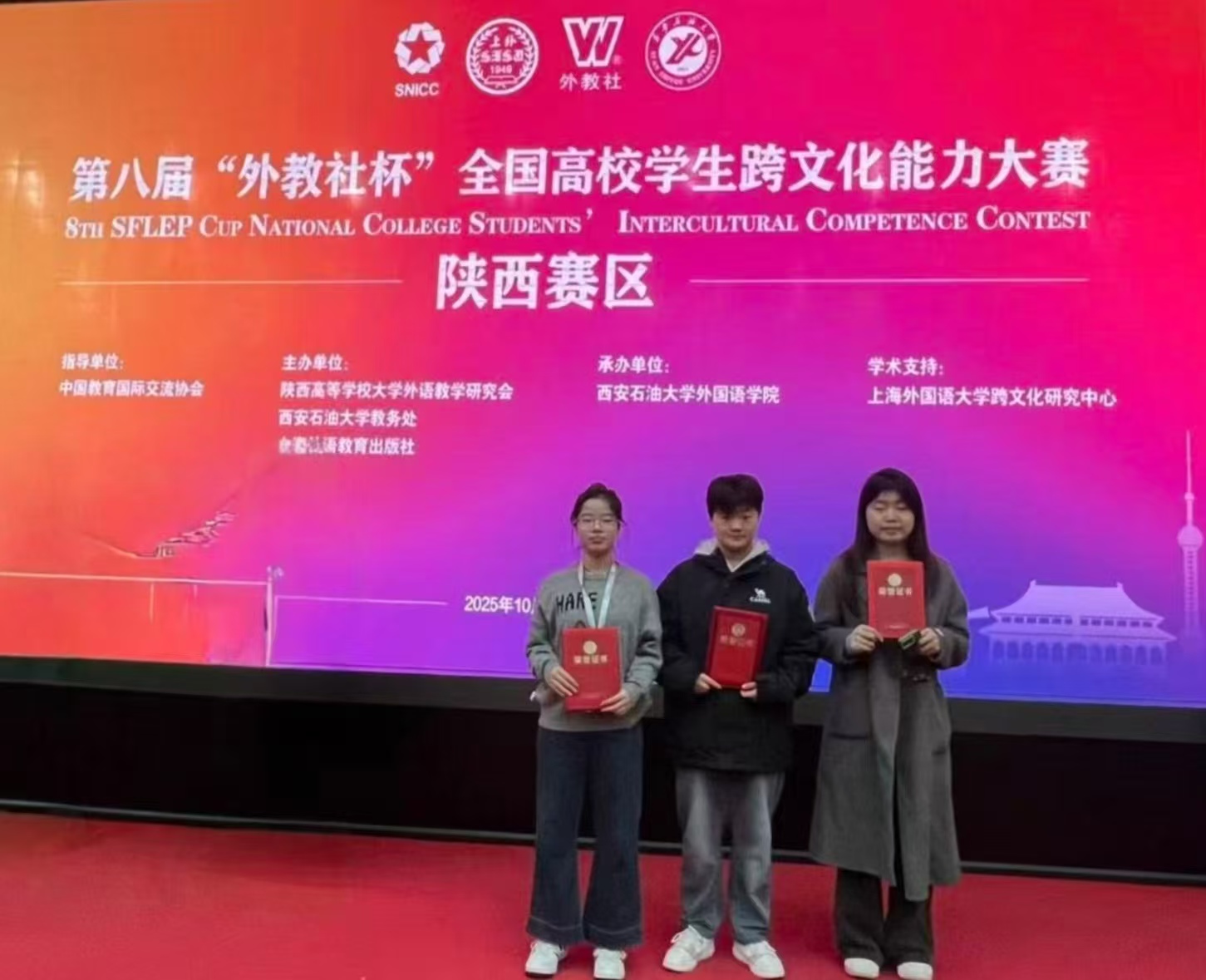10月18日至19日,由陕西高等学校大学外语教学研究会组织的2025年第八届“外教社杯”全国高校学生跨文化能力大赛陕西赛区复赛与决赛在西安石油大学雁塔校区圆满落幕。ac米兰英语专业张婉琪、会计学专业高思凡和机器人工程专业房博雅三人组成的代表队凭借扎实的跨文化理论功底、出色的现场应变能力与团队协作精神,最终荣获省级三等奖,充分展现了学校在国际化人才培养领域的扎实成果。