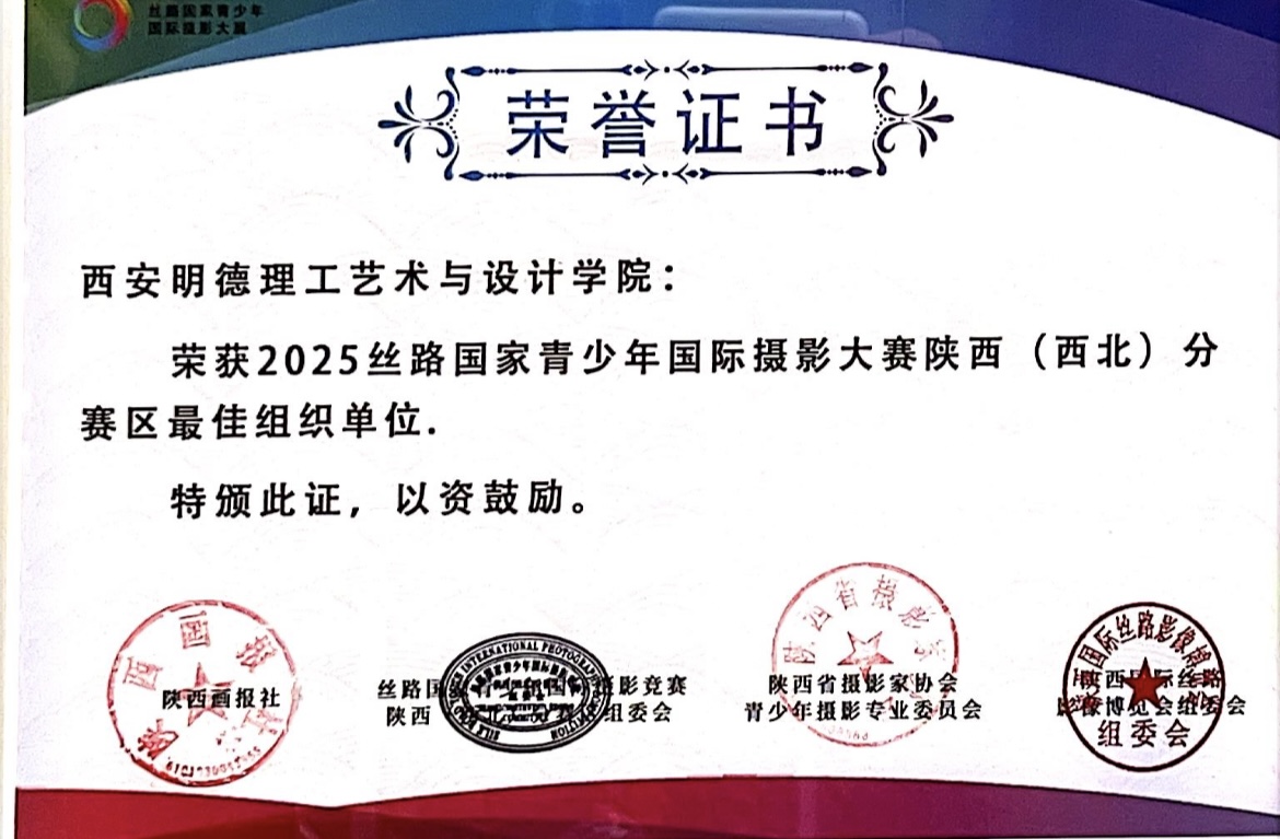 2025年10月25日,第九届丝路国家青少年国际摄影大展陕西赛区颁奖仪式,在西安市翠华里隆重举行。西安明德理工艺术与设计学院凭借出色的组织工作与丰硕的育人成果,荣获陕西赛区“最佳组织单位”称号。