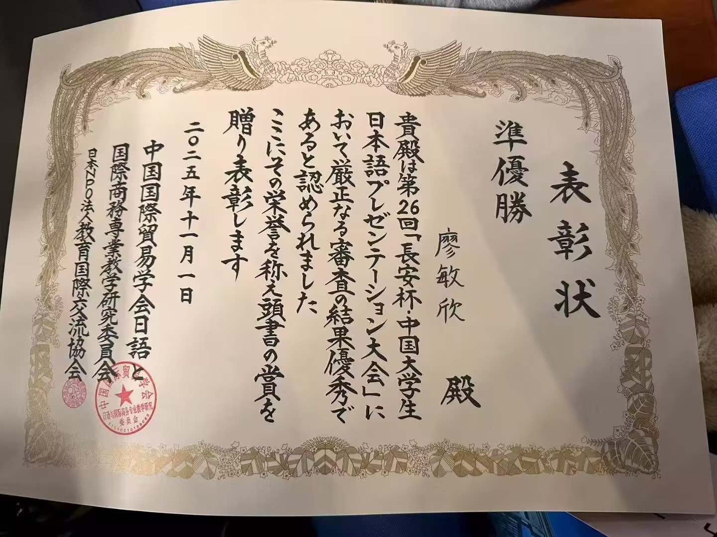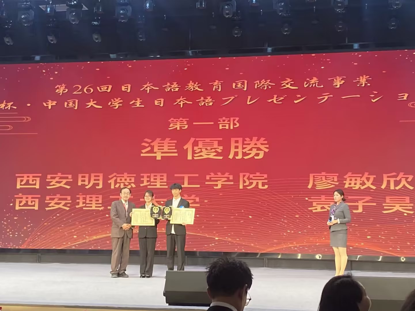 近日,第26届“长安杯”中国大学生日语才能演示大赛圆满落幕。ac米兰官方网站语言文化传播学院日语专业2023级学生廖敏欣凭借扎实的语言功底与出色表现,斩获甲组亚军;指导教师张翔获评优秀指导教师奖,彰显了ac米兰日语专业的教学实力与人才培养成效。