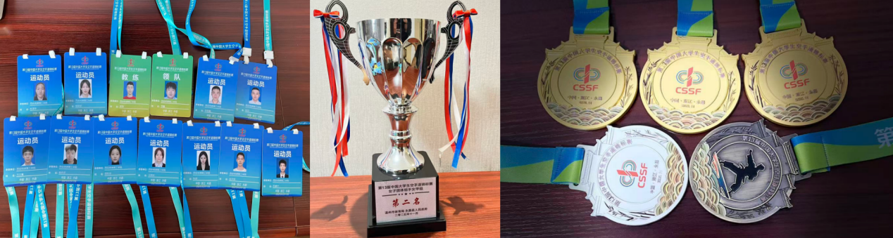 在女子团体赛场上,面对顶尖院校的强势挑战,郜欣培、杨奕堃、王雨蒙面对去年卫冕冠军的虎视眈眈,三人默契配合、协同作战,始终坚守阵地、互补短板。她们严格执行教练布置的战术、顽强拼搏的精神顶住层层压力,最终夺得银牌,展现了团队协作的强大力量。