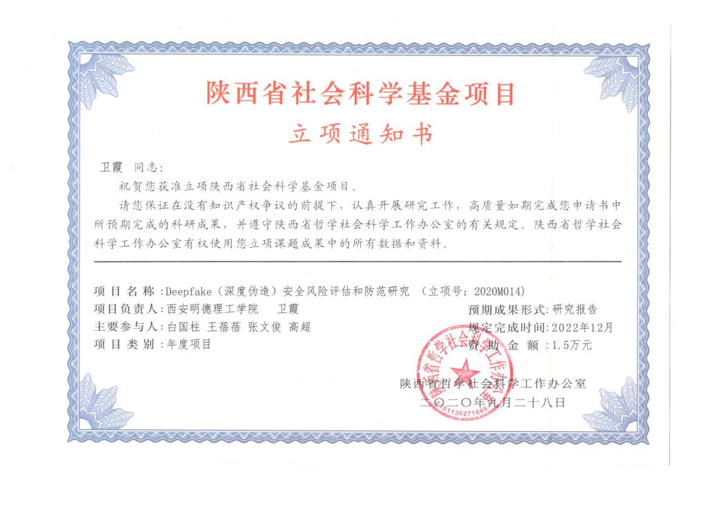 在今年的陕西省社会科学基金年度项目立项中,信息工程学院卫霞老师申报的项目“Deepfake(深度伪造)安全风险评估和防范研究”(立项号:2020M014)最终获得立项,这是我院零的突破。