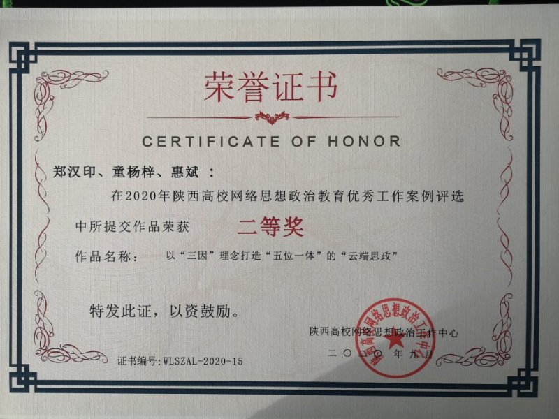 2020年7月至8月,按照教育部“共抗疫情、爱国力行”主题宣传教育和网络文化成果征集展示工作要求,陕西省高校思想政治工作中心开展了2020年陕西省高校网络思想政治教育优秀工作案例评选活动,郑汉印副院长以身作则,认真总结相关工作成果与经验,在紧张的工作之余撰写的题为《以“三因”理念打造“五位一体”的“云端思政”》案例,在全省41所高校提交的207件作品中,荣获陕西省二等奖。
