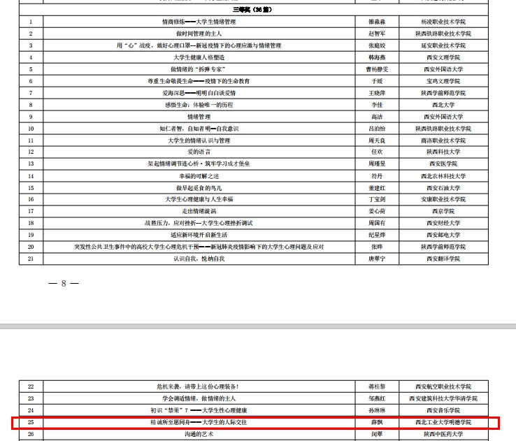 2020年5月至7月,省教工委实施了第五届“阳光护航”心理教育育人宣传季实践活动,期间开展了陕西高校第六届大学生心理健康教育优秀咨询案例和优秀教案评选。通识教育学院心理健康教育教师薛飘提交的题为《世界上唯一的花——萨提亚视角下的一例自杀危机干预》案例,在全省61篇优秀咨询案例中,荣获陕西省二等奖;提交的《精诚所至愿同舟——大学生的人际交往》教案,在陕西高校第二届心理健康教育优秀教案评选中,荣获陕西省三等奖。