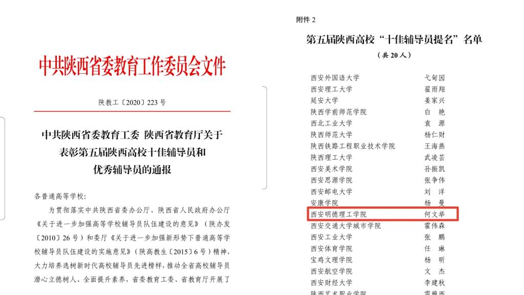 近日,由中共陕西省委教育工委主办的第五届陕西省高校十佳辅导员和优秀辅导员评选表彰活动结果公示,艺术与设计学院何文举获得第五届陕西省高校“十佳辅导员提名”荣誉称号。