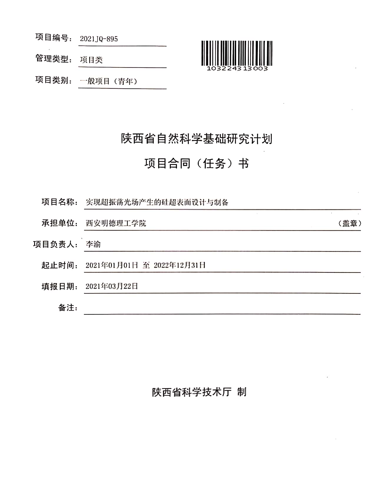 近日,ac米兰李渝老师主持的《实现超振荡光场产生的硅超表面设计与制备》项目经过网上申报,专家评审等环节,已获批2021年度陕西省自然科学基础研究计划项目立项,项目类别为一般项目(青年)类,项目编号为2021JQ-895。