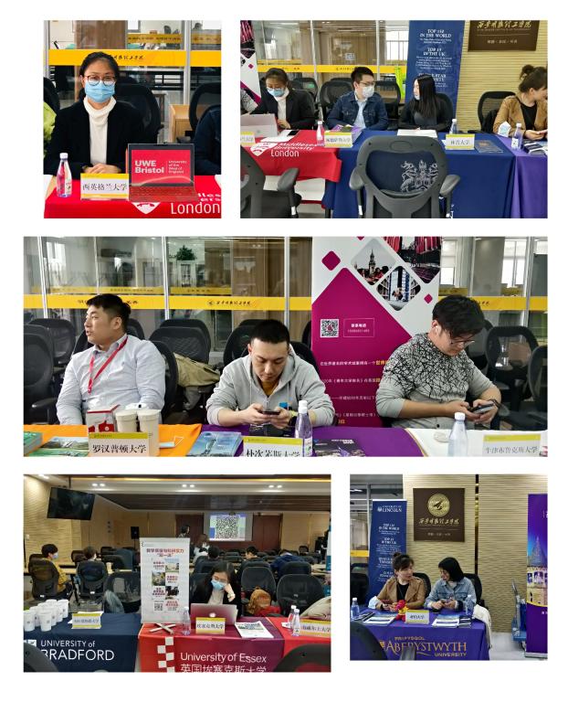 行前培训会结束后,由教育部留学服务中心组织的海外院校面询会顺利开启,此次参展的海外大学包括英国西英格兰大学、布拉德福德大学、切斯特大学、利兹贝克特大学、林肯大学、牛津布鲁克斯大学、埃塞克斯大学、亚伯大学、匈牙利多瑙新城大学、加拿大加西大学等21所海外合作院校。