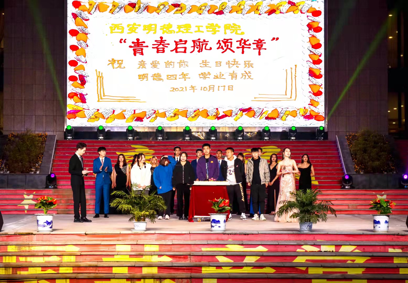 临至高潮时段,十名当天生日的新生被主持人点名起立,接受全校数千师生的现场祝福,动感青春的迎新晚会秒变温馨浪漫的“生日趴”。