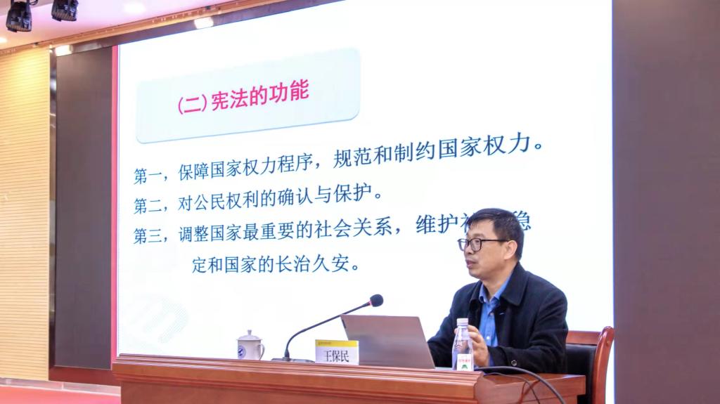 王保民以“弘扬宪法精神 树立宪法权威”为题,结合自身多年来对宪法和党内法规研究的基础上,从宪法的本质与新中国宪法的演变、十八大以来中央关于宪法及其监督实施的新论述、我国宪法监督实施存在的主要问题和推进依宪治国的新举措等方面进行了全面又深入的阐释,语言生动形象、论述精辟严密,能够将理论与实际紧密结合,并就忠于宪法、遵守宪法、维护宪法、履行宪法提出了针对性的建议。