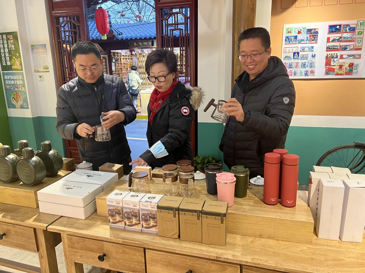 最后,段晓玉总经理带领学校一行人参观了永兴坊和人民日报联名打造的人民日报文创体验中心。人民日报文创是利用自身的媒介传播优势和强大的社会公信力与永兴坊非遗文化品牌IP的全国影响力、优秀传统文化的创新再造能力相结合,一起促进非遗文化创意品牌的跨界融合,让传统品牌获取新的生命力,也为学院培养文创方面的人才提供新思路。