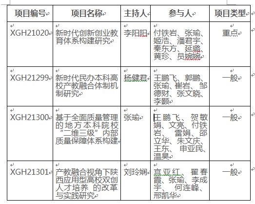 近日,2021年度陕西省高等教育学会高等教育科学研究项目立项结果公布,经专家评审,学校共4项课题获准立项,其中重点研究项目1项,一般研究项目3项。