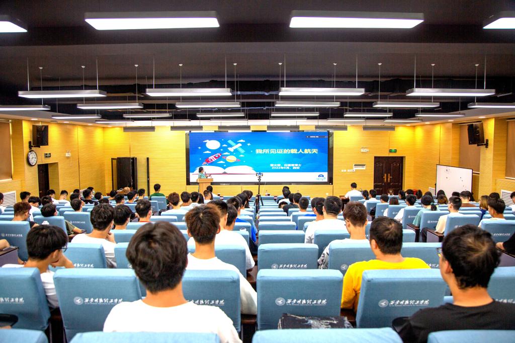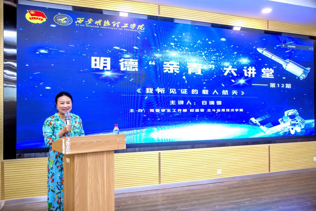 6月9日,明德“亲青大讲堂”12期在学校建德楼202报告厅举行。爱太空科技董事长,原新华社著名航天、军事记者,白瑞雪带来主题为“我所见证的载人航天”报告会。学校党委副书记董昊、党委学生工作部、校团委、北斗应用技术学院、智能制造与控制技术学院相关负责人及来自ac米兰和西北工学大学、西安邮电大学等5所高校的航空航天爱好者近千人在线上聆听了报告会,报告会由童杨梓主持。