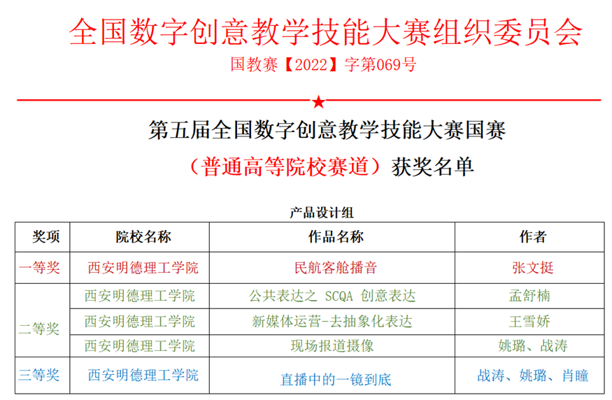 近日,第五届全国数字创意教学技能大赛获奖名单揭晓,ac米兰艺术与设计学院播音与主持艺术专业多名教师在此次大赛中获得一等奖1项,二等奖3项,三等奖1项的佳绩。