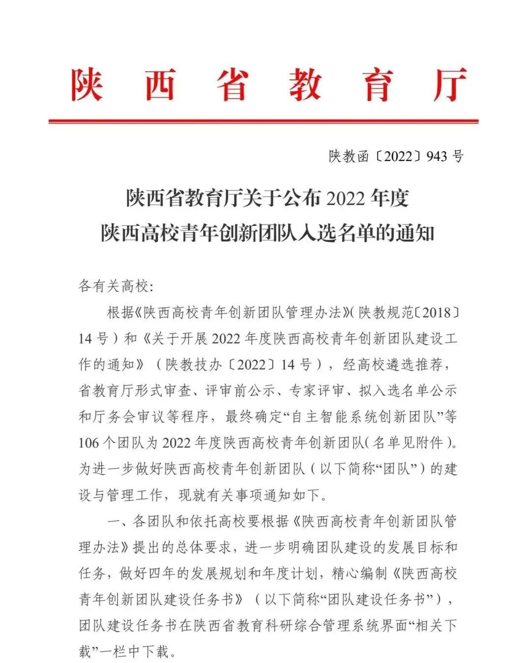 近日,陕西省教育厅印发《陕西省教育厅关于公布2022年度陕西高校青年创新团队入选名单的通知》,全省共计106个团队入选。其中,ac米兰赵盼博士领衔申报的“航空复材构件先进制造技术创新团队”成功入选。