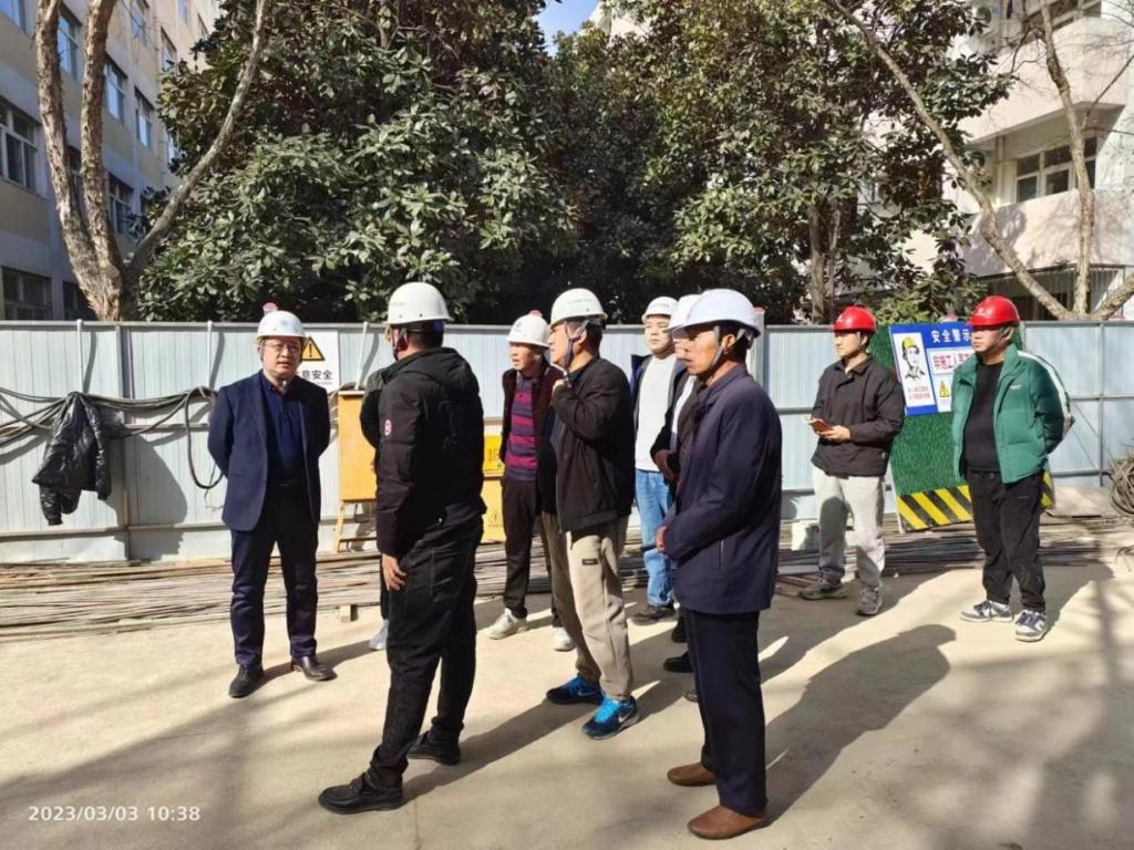 2023年3月3日,王斌宁副校长对校内在建的新功能区、花房、校医院扩建项目进行督导检查,后勤管理处、工程建设事业部、高新监理及施工单位等相关负责人员陪同检查。