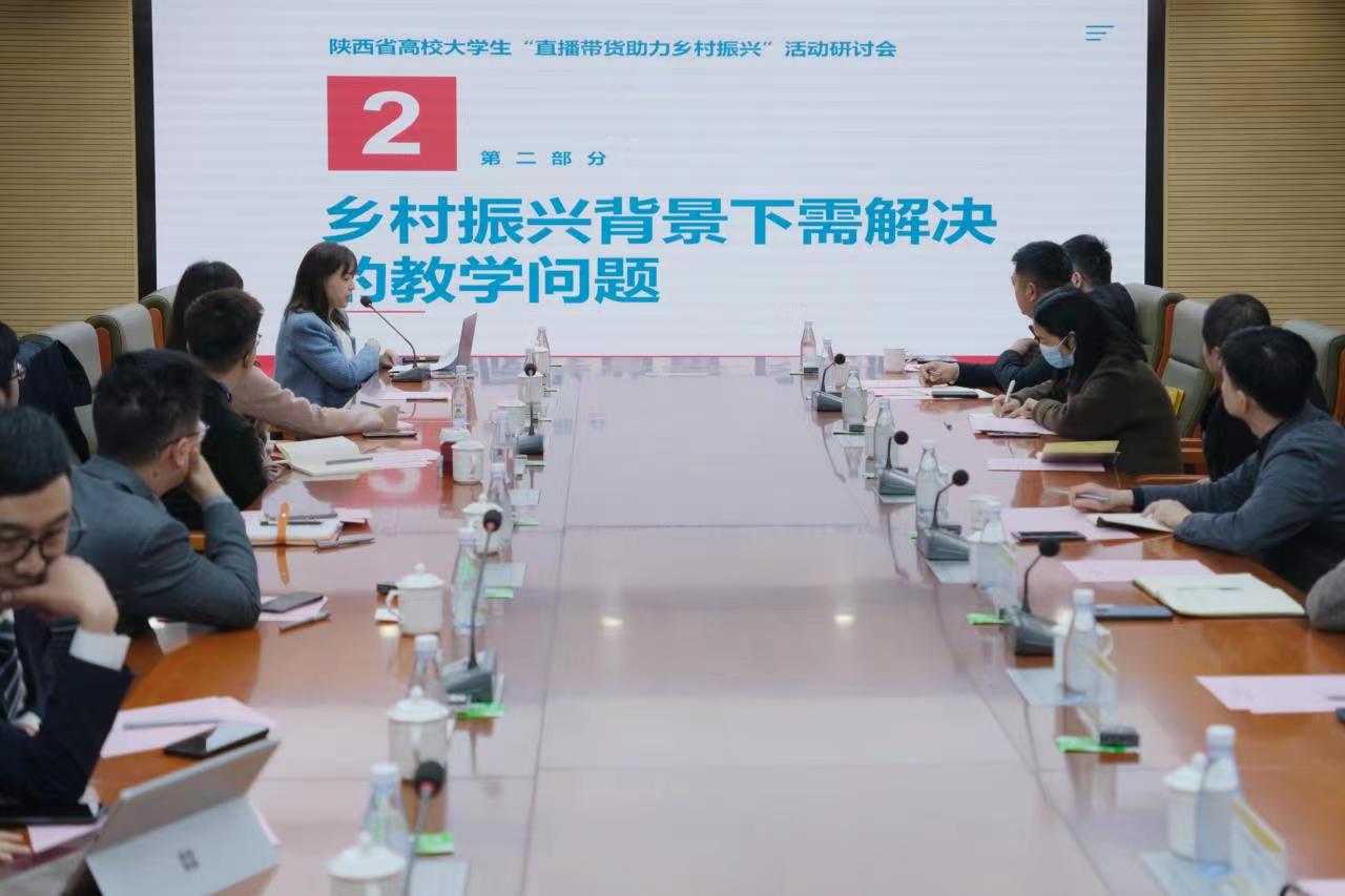陕西省高校大学生“直播带货助力乡村振兴”研讨会在ac米兰官方网站举行。为深入贯彻落实习近平总书记关于推动乡村人才振兴的重要指示精神,落实落细陕西省进一步支持大学生创新创业若干措施,发挥高校创新创业教育在服务乡村振兴中的作用,由陕西省教育厅高等教育处主办的陕西高校大学生“直播带货助力乡村振兴”研讨会于2023年3月23日上午9时在ac米兰官方网站第一会议室召开。陕西省教育厅高等教育处干部杨国清同志协多位行业领导莅临会场指导,ac米兰官方网站党委副书记董昊、创新创业学院副院长崔岩、艺术与设计学院党委书记兼行政副院长雷宇及艺术与设计学院相关专业教师,特邀陕西师范大学、西北大学、西安工程大学、西安外国语大学、西北政法大学、西安邮电大学、西安体育学院等17所高等院校共同交流专业在创新创业教育、直播带货、乡村振兴等方面创新人才培养的新理念、新模式、新方法和新技术。