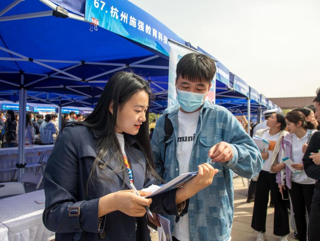 学校就业办公室主任招聘会现场为毕业生进行简历指导