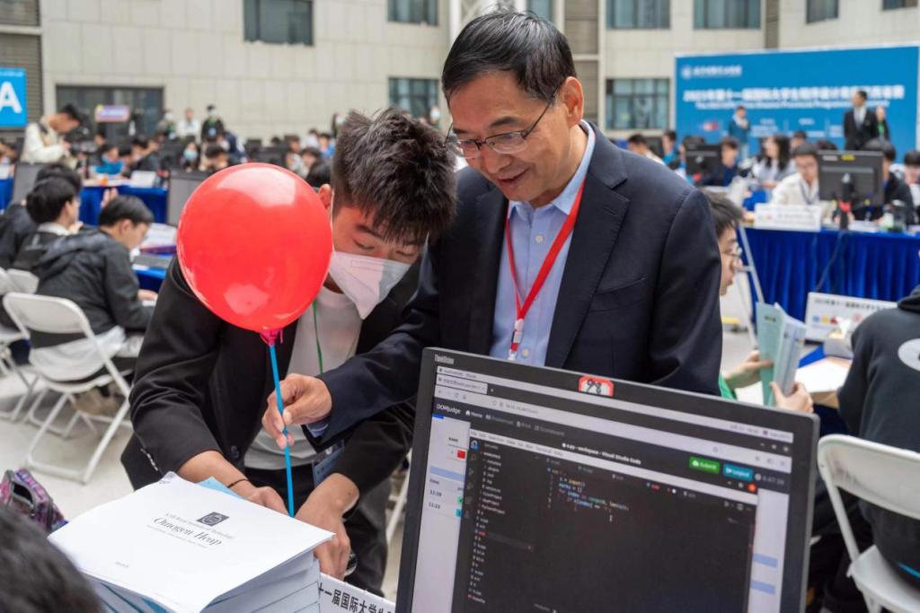 上午11:20,比赛在明心楼中厅正式开始。陕西省计算机教育学会理事长耿国华、校长杨健君来到比赛现场检查指导赛事工作。校长杨健君为第一支完成赛题的参赛队伍派发气球。