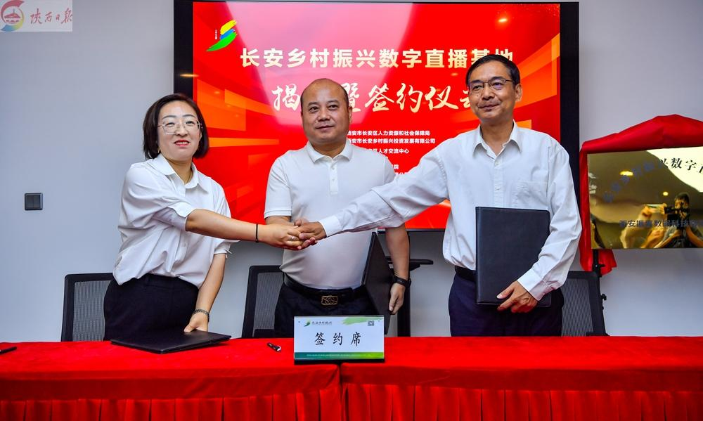 会上,长安区人社局人才服务中心主任刘峰、西安市长安乡村振兴投资发展有限公司总经理龚文军为长安乡村振兴数字直播基地揭牌并致辞。