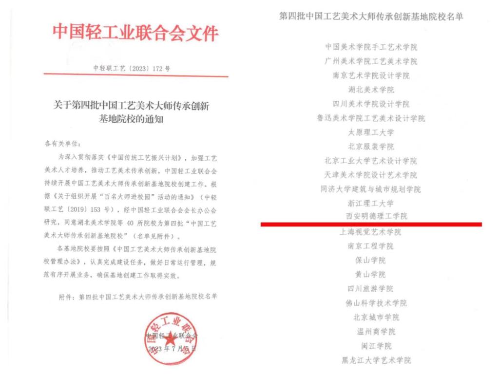 ac米兰为深入贯彻落实《中国传统工艺振兴计划》,加强以设计艺术人才培养为基础,推动工艺美术人才协同发展,全面实施相应国家工艺美术传承创新的号召,自2018年通过国家级和省级工艺美术大师的引进,课程体系的配比优化,以视觉传达设计专业为母体,联动艺术与设计学院多专业学科共同推动,通过五年的教学经验积累,于近日获批第四批“中国工艺美术大师传承创新基地院校”,将由中国轻工业联合会授予“中国工艺美术大师传承创新基地院校”称号并颁发牌匾。