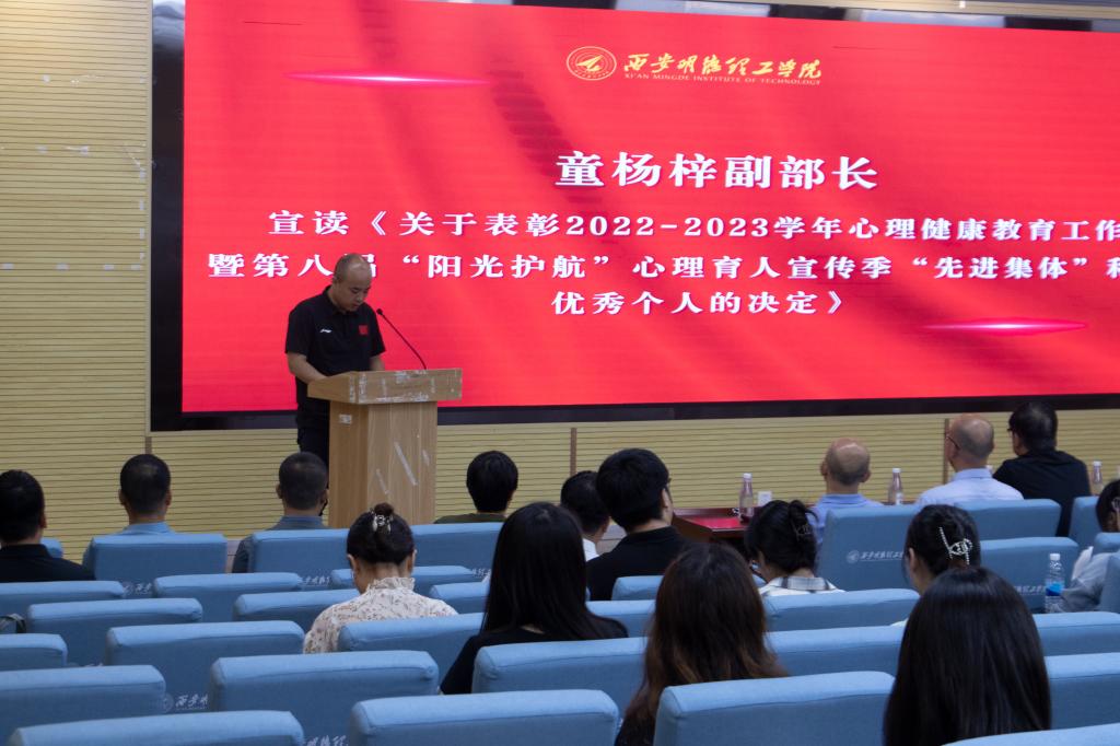 会上,大学生心理健康教育中心主任薛飘老师作题为《立德树人守初心心理育人担使命》的工作总结;党委学生工作部副部长童杨梓宣读了学校《关于表彰2022-2023学年心理健康教育工作暨第八届“阳光护航”心理育人宣传季“先进集体”和优秀个人的决定》;向2022-2023学年心理危机预防与干预体系建设优秀单位、第八届心理育人宣传季优秀组织单位、2022-2023学年“最奉献心理育人好老师”、2022-2023学年“最美心理委员”以及学校首届心理健康科普知识竞赛获奖的学生和指导教师分别进行了表彰。