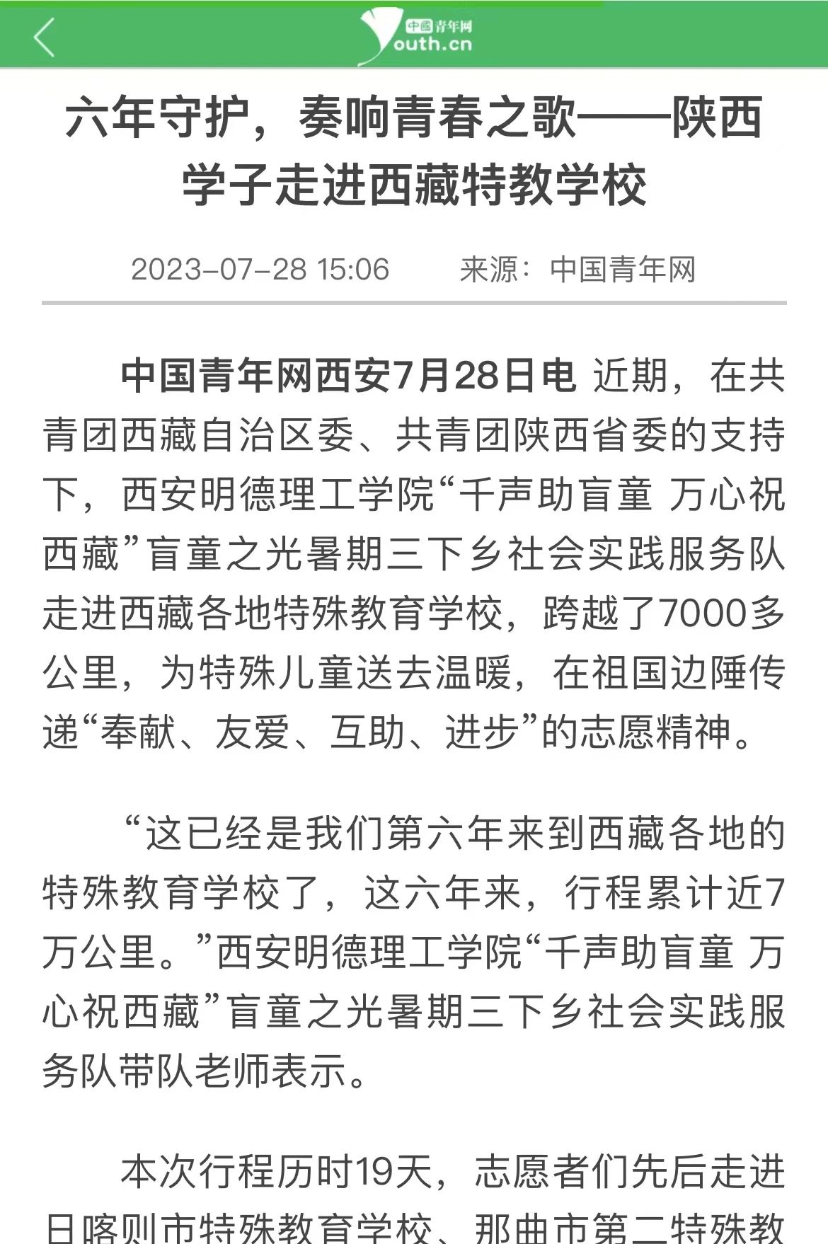 阳光助残风雨六年,民族团结繁花盛开。在西藏自治区团委、共青团陕西省委的大力支持下,ac米兰官方网站党委的关怀下,ac米兰官方网站“千声助盲童万心祝西藏”盲童之光暑期三下乡社会实践服务队秉持初心,风雨无阻,连续6年走进西藏各地特殊教育学校,践行民族团结政策,情系藏区盲童,在日喀则市特殊教育学校、那曲市第二特殊教育学校、昌都市特殊教育学校、拉萨市特殊教育学校、山南市特殊教育学校、林芝市特殊教育学校等6所学校捐赠“声音图书馆”、“盲童听书室”,累计开展支教活动共9次,服务残障儿童近千人,累计行程近7万公里,累计捐赠爱心物品超20万,并为西藏各特殊教育学校送教上门,开展《铸牢中华民族共同体意识宣讲》《习近平法治思想宣讲》《教师礼仪与沟通艺术》《特教教师的自我成长与心理解压》、《手机摄影与生活哲学》、《儿童律动训练》、《盲人按摩实操》等精品课程。