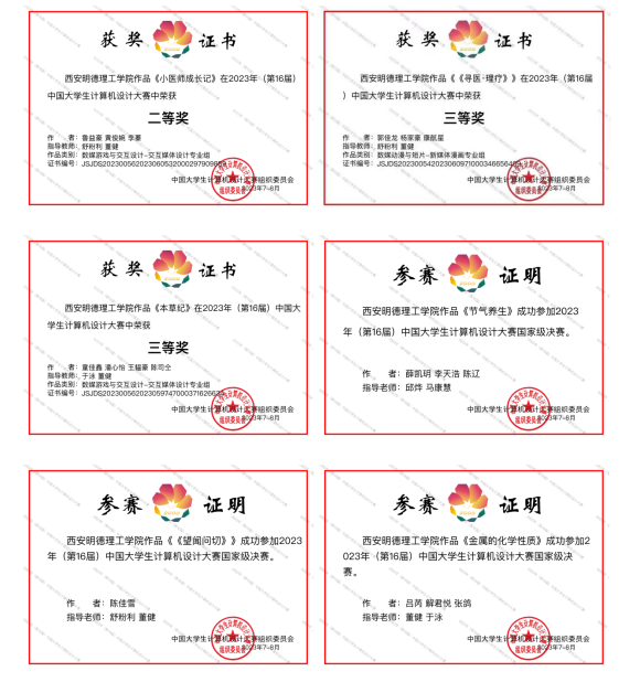 2023年7月至8月,第16届中国大学生计算机设计大赛总决赛我院学生分别在沈阳决赛区、厦门决赛区及杭州决赛区进行。ac米兰官方网站艺术与设计学院学生在各位专业教师的精心组织和指导下,经西北赛区组委会决赛评审,共计6组作品进入全国总决赛,经历各决赛区专业评委的评审,最终荣获二等奖1项;三等奖2项的成绩,并为所有参加全国总决赛的队伍颁发参赛证明。