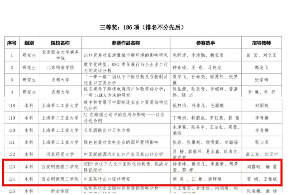 此次竞赛有来自西北工业大学、安徽大学、上海大学等百余所高校师生参赛,通过竞赛进一步夯实了国际经济与贸易专业学生的理论知识、开阔了专业视野、增强了思辨能力、提高了学术写作水平,为学院培养应用型人才开拓了新的思路,也为专业建设奠定了基础。