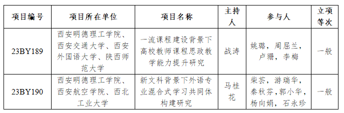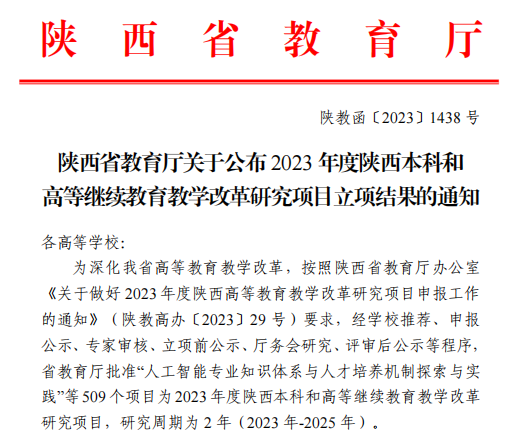 近日,陕西省教育厅下发了《关于公布2023年度陕西本科和高等继续教育教学改革研究项目立项结果的通知》(陕教函〔2023〕1438号),ac米兰战涛老师主持的“一流课程建设背景下高校教师课程思政教学能力提升研究”和马桂花老师主持的“新文科背景下外语专业混合式学习共同体构建研究”的2个教育教学改革研究项目成功获批省级立项。