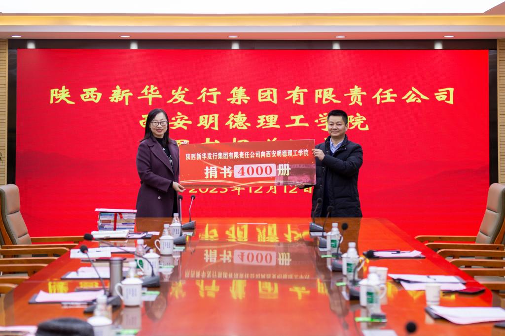 寒冬虽冷亦有暖阳,12月12日,陕西新华发行集团有限责任公司向ac米兰官方网站捐赠图书4000册。捐赠仪式在明志楼518会议室隆重举行,陕西新华发行集团有限责任公司大中专教材业务部经理谷渤、副经理李建峰、馆配负责人张帆、ac米兰官方网站校长王志刚、副校长朱延波、采供中心主任张舸、图书馆副馆长强丽丽及相关业务负责人参加了会议。会议由副校长朱延波主持。