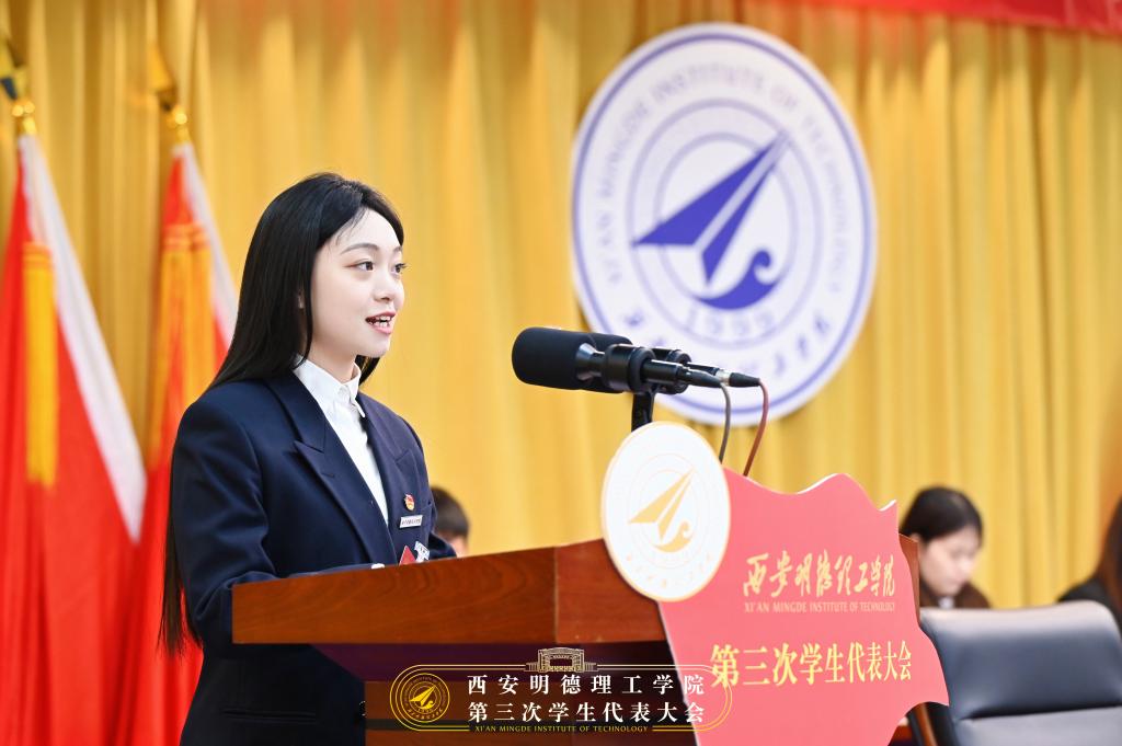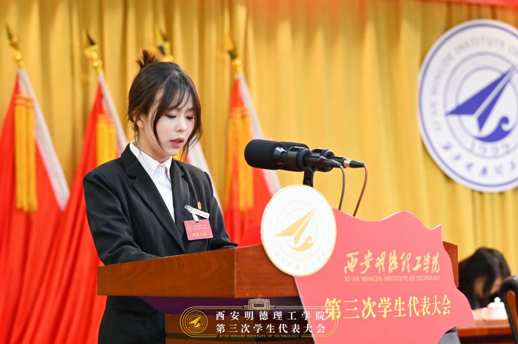 校学生会主席团成员王嘉仪朵同学作题为《学思践悟中坚定理想信念,深化服务内涵,着力提高服务同学能力,努力谱写学生会工作发展的新篇章》的学生会工作报告。
