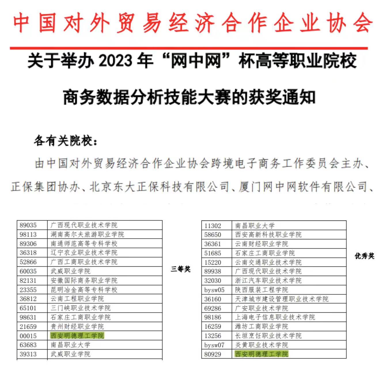 近日,2023 年“网中网”杯高等职业院校商务数据分析技能大赛国赛结果已公布:我院学生荣获三等奖、优秀奖各一项。