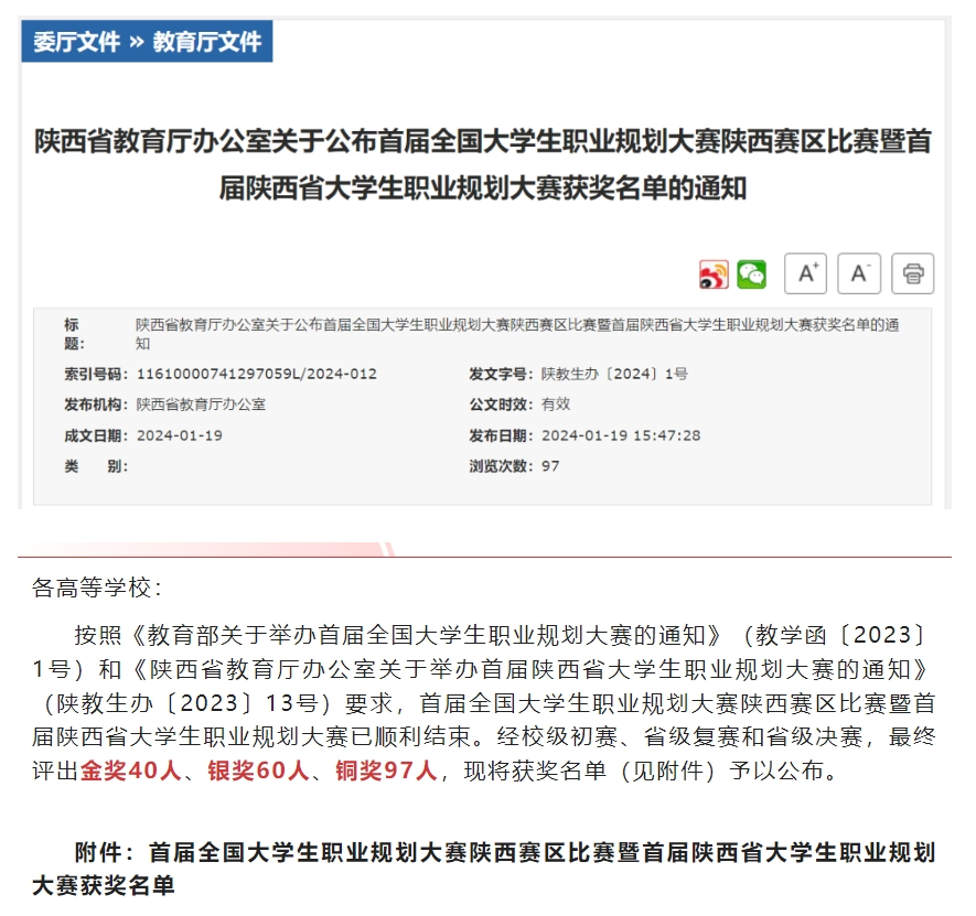 全国大学生职业规划大赛由教育部、上海市人民政府共同主办。本届陕西省大学生职业规划大赛由陕西省教育厅主办,成长赛道由陕西师范大学承办,就业赛道由西安电子科技大学承办。省赛以“筑梦青春志在四方,规划启航职引未来”为主题,开赛以来,全省有93所高校35.9万名学生报名参与,本次总决赛设置学生成长赛道和就业赛道两个赛道,每个赛道设高教组和职教组。经过层层选拔和激烈角逐,200名选手入围陕西赛区总决赛,产生40名金奖、60名银奖、97名铜奖。