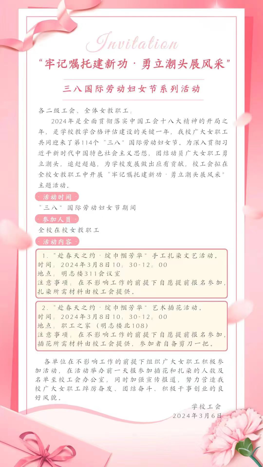 三月春意浓,巾帼绽芳华。在第114个“三八”国际劳动妇女节来临之际,为深入贯彻习近平新时代中国特色社会主义思想,更好地凝聚自信自强、守正创新的精神力量,团结动员广大女职工勇立潮头,追赶超越,为学校发展做出应有贡献,校工会在女教职工中开展“牢记嘱托建新功·勇立潮头展风采”主题活动。