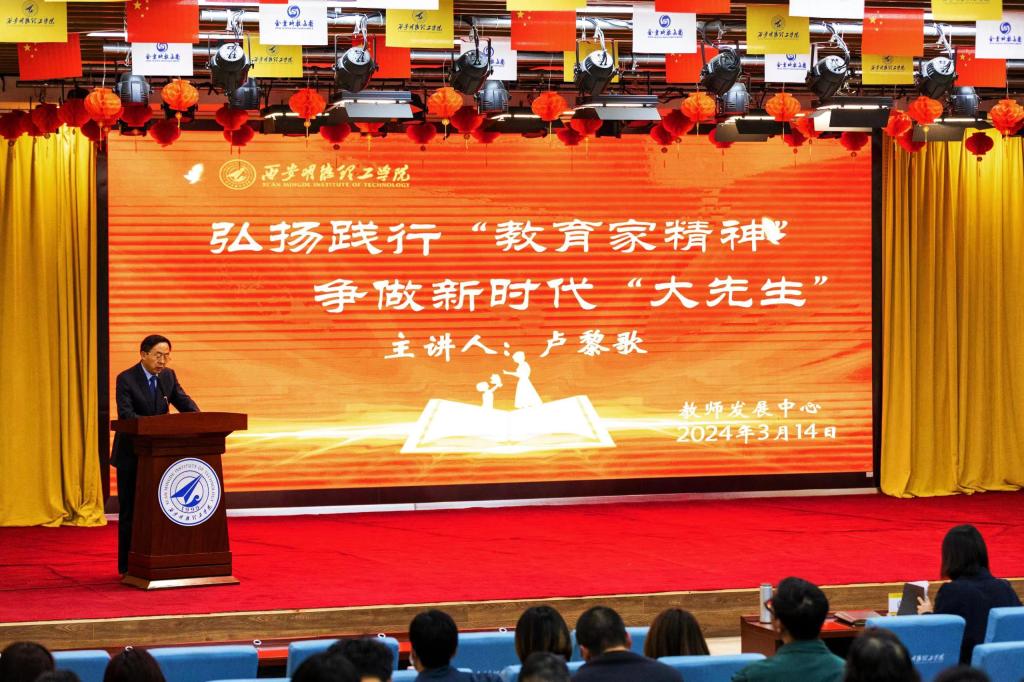 为贯彻落实习近平总书记关于大力弘扬教育家精神的重要指示精神,全面落实学校2024年工作部署,加强教师队伍高质量专业化建设,营造弘扬践行“教育家精神”,争做新时代“大先生”的良好氛围,3月14日下午,ac米兰官方网站教师发展中心在建德楼203报告厅举办“弘扬践行教育家精神,争做时代大先生”报告会。邀请西安交通大学卢黎歌教授担任主讲,教师、辅导员、行政人员约350人参加。报告会由白秦川副校长主持。