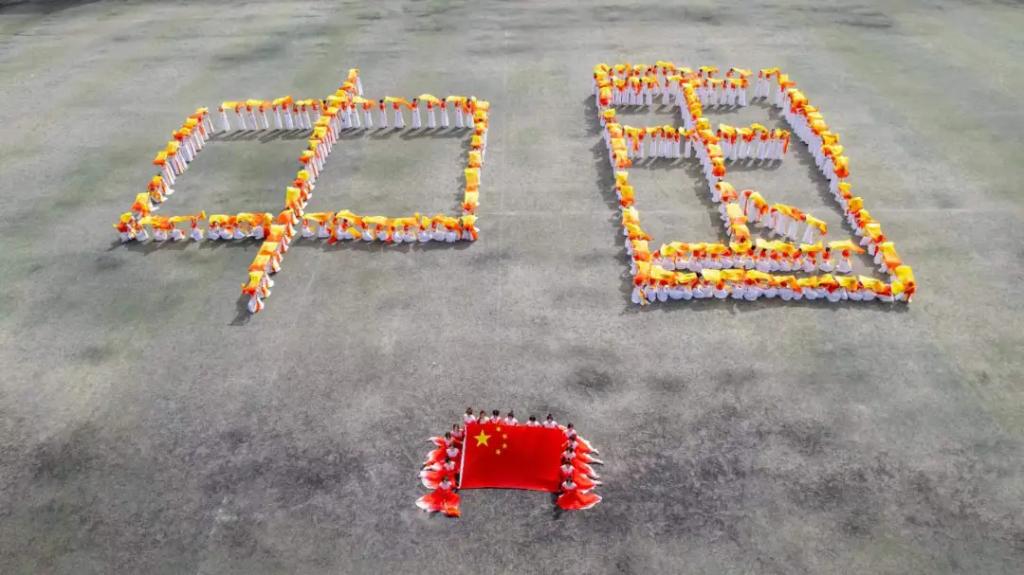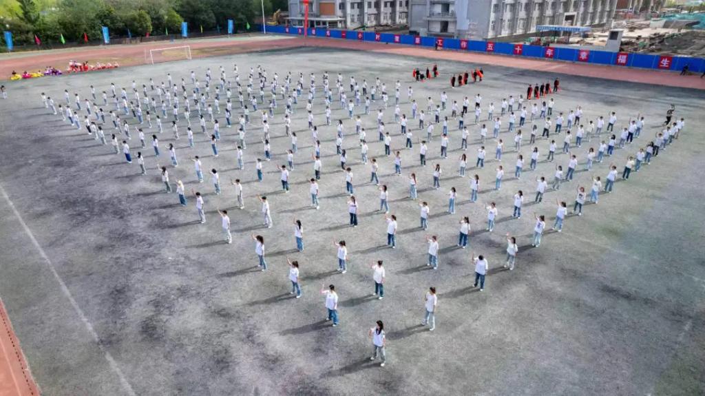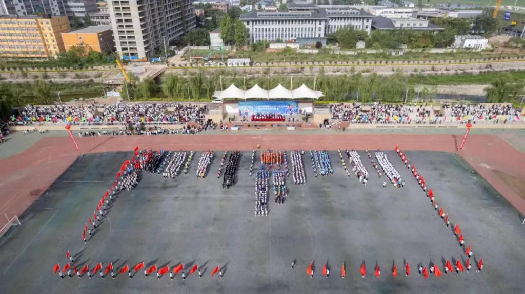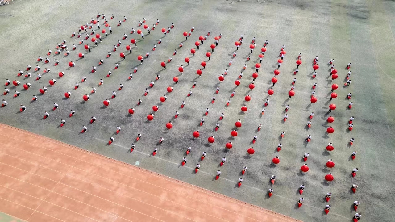 团体操《灯火里的中国》,场上由288名同学摆成了汉字“中国”,全体明德学子衷心的祝愿伟大的中国繁荣昌盛,国泰民安。