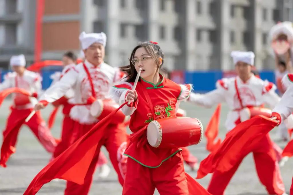 舞狮醒盛世,鼓声震乾坤,龙舞翩跹,宛若流水行云,腰鼓声声,激昂高亢,龙狮腰鼓表演队员翻腾起舞,精彩的表演迎来了一片喝彩。