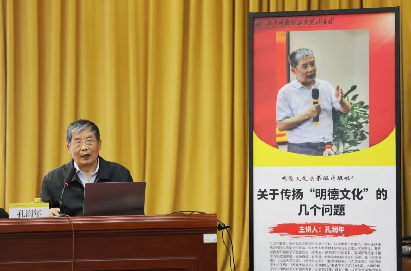 开班仪式后,ac米兰马克思主义学院特聘教授、陕西省价值哲学学会副会长、陕西省伦理学研究会副会长孔润年教授作了题为“关于传扬‘明德文化’的几个问题”的专题讲座。孔教授以详实的史料记载为依据,理实结合、旁征博引、层层递进地阐述了自己对“明德”“明德文化”及“明德文化内涵”的理解与认识。